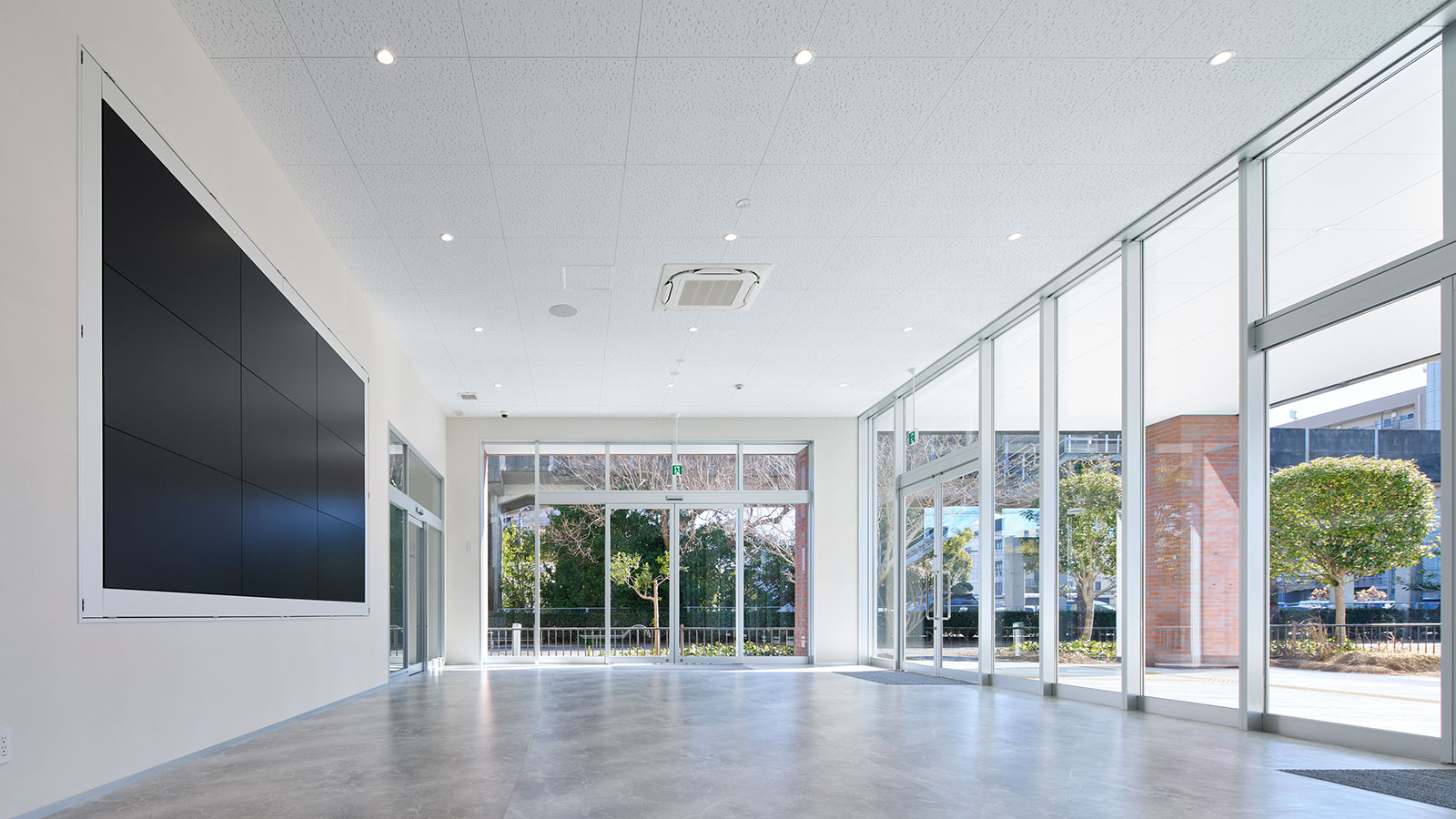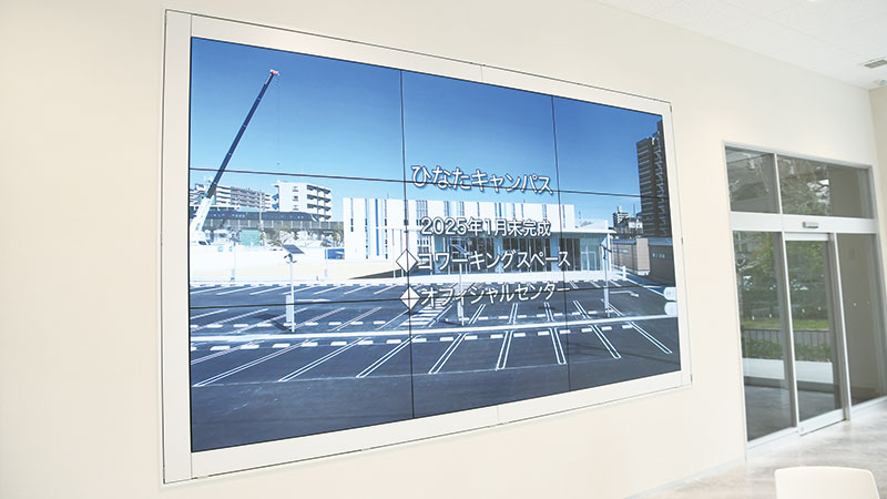 正面エントランスに設置された200インチの大型液晶パネルをはじめ、館内各所のデジ...