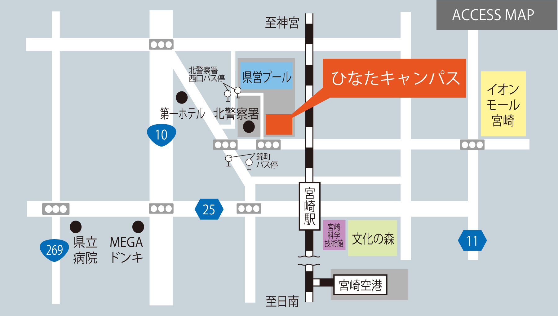 • バス……宮崎交通 北警察署西口バス停より徒歩3分